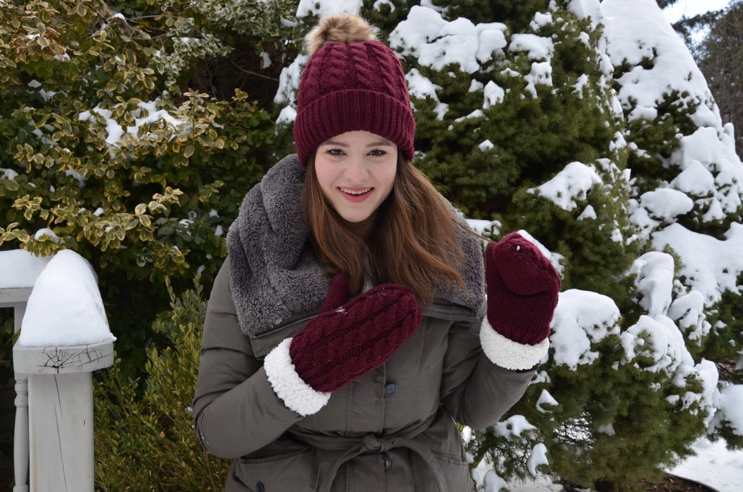 This Just Cozy set includes a Hat and a pair of Mittens. The Knitted Hats and Mittens have a fluffy super soft and comfy Sherpa lining to keep your head and hands warm. Amp up any look with a stylish and easy to wear set.